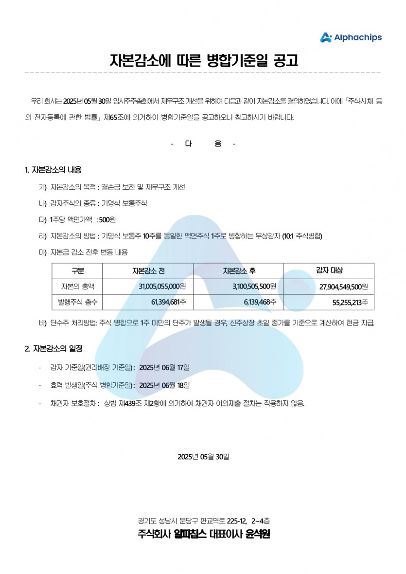 자본감소에 따른 주식 병합기준일 설정 공고.